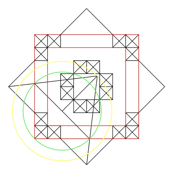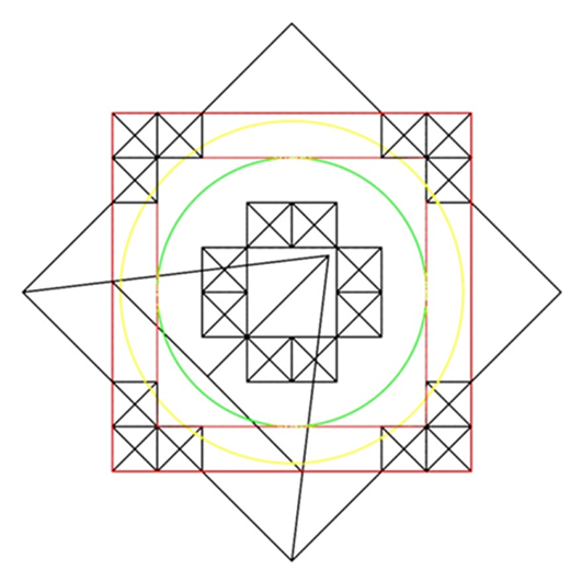 Die Grundseitenlänge eines Kleinquadrats beträgt 1, der Radius des kleineren Kreises beträgt 3, der des größeren Kreises beträgt 10/φ2 = 3,82. Weiter gibt es ein größeres Quadrat mit der Grundseitenlänge 6 x √2 = 8,485, das im Winkel von 45° zum kleineren Quadrat versetzt ist (Graphik 2).