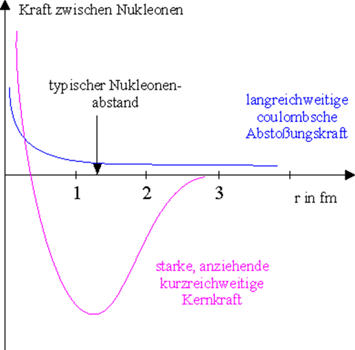 Durch die starke Kernkraft werden die Protonen auf engstem Raum zusammengehalten. Die starke Kernkraft ist etwa hundertmal stärker als die Abstoßung gleichnamiger Ladungen nach dem Coulombschen Gesetz. Die Coulomb – Kräfte haben eine lange Reichweite (bis 10-17 m), wohingegen die starke Kernkraft nur zwischen benachbarten Nukleonen wirkt.