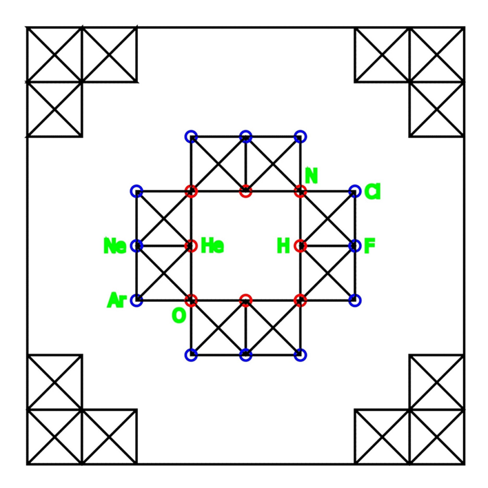 Auf den Eckpunkten der Kleinquadrate des inneren Figurenteils befinden sich die Protonen der ersten zwanzig Elemente des Periodensystems. Die Protonen von Wasserstoff und Helium liegen einander gegenüber und sind die Erklärung für die erste magische Zahl 2. Es folgen die nächsten Protonen der Elemente Lithium, Beryllium, Bor, Kohlenstoff und Stickstoff bis zum Element acht, dem Element Sauerstoff. Sie befinden sich auf den Quadrateckpunkten, die dem Mittelpunkt der Kernmatrize am nächsten sind (rot in Graphik 8). Dies bildet ein inneres Quadrat, dessen Plätze nun vollständig belegt sind, somit ein Kriterium hoher Stabilität und eine Erklärung für die zweite magische Zahl 8.