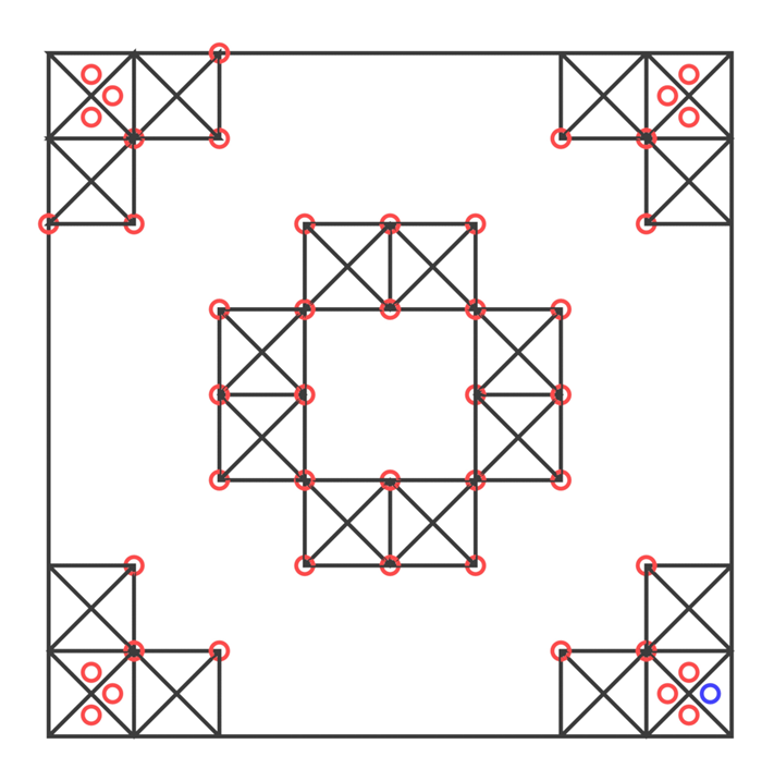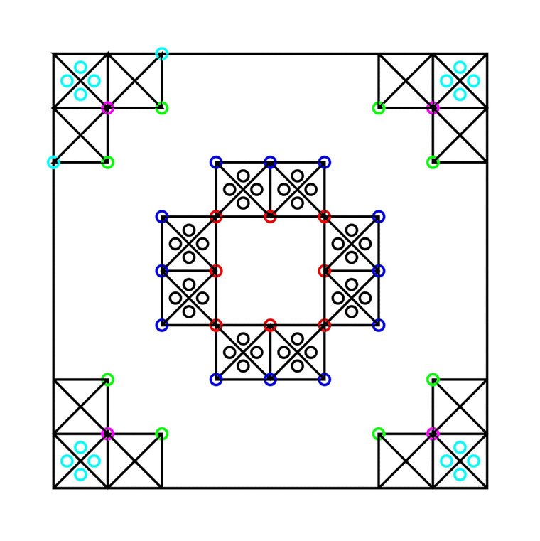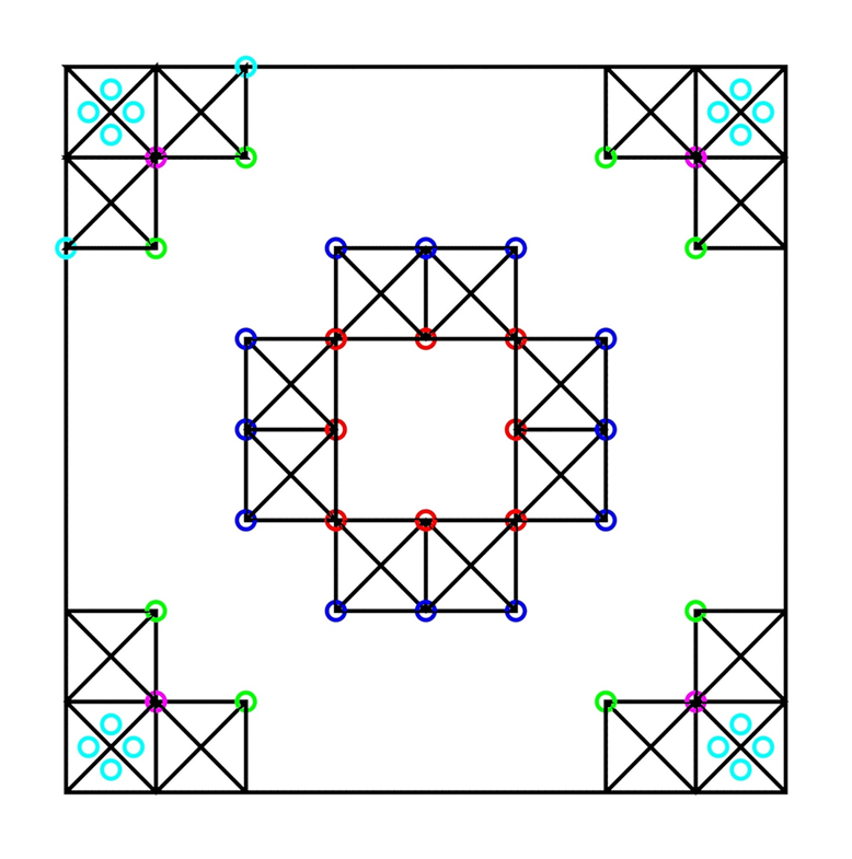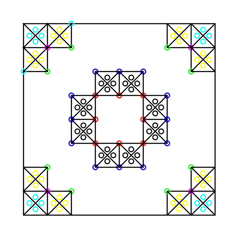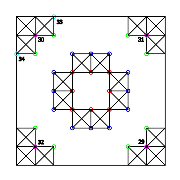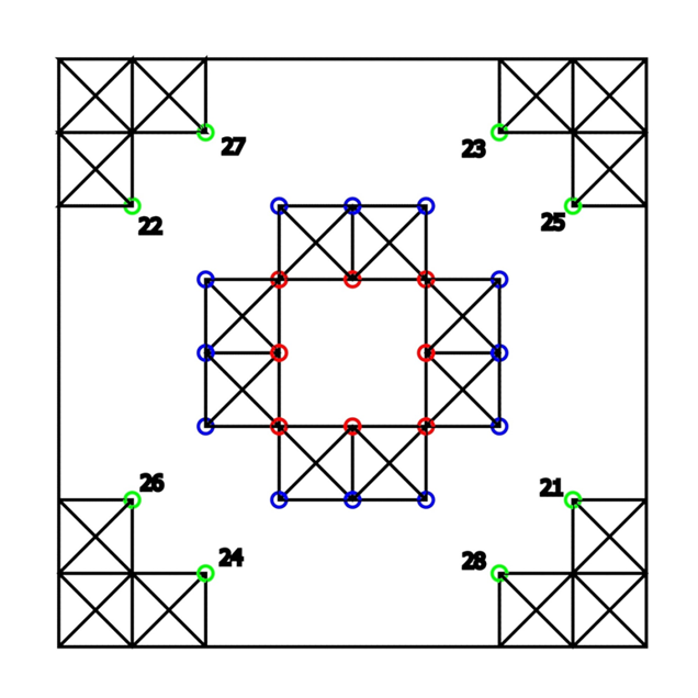 20 ist die nächste magische Zahl. Die Quadrateckpunkte des inneren Figurenteils sind nun alle belegt, wiederum Ausdruck einer hohen Stabilität.