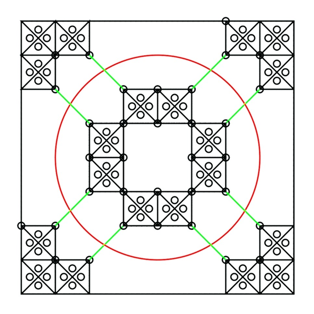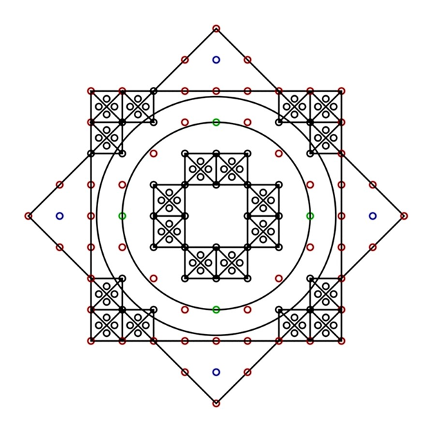 Die Geoglyphe aus Peru ist die Matrize für die Atomkerne. Auf den Eckpunkten der durch Diagonalen markierten Kleinquadrate und in deren Inneren sitzen die Protonen, die Neutronen befinden sich auf den beiden erwähnten Kreisen.