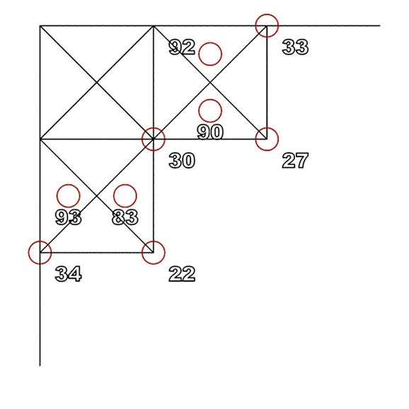 Mit Proton 34 ist die Belegung der Quadrateckpunkte beendet. Die restlichen Protonen werden alle innerhalb der mit Diagonalen markierten Kleinquadrate eingebaut. Das ist eine hundertprozentige Entsprechung zum Neutronenbereich, wo auch mit Neutron 34 die Belegung der Segmenttrennungslinien beendet ist (siehe dort).