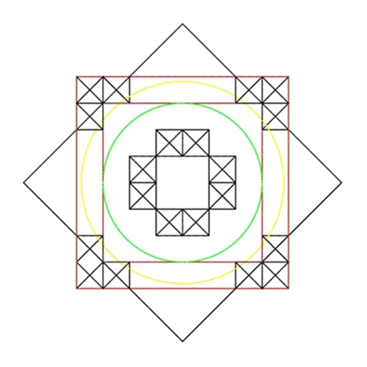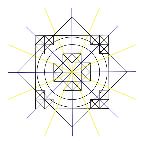 In jede Quadratseite passen genau 8 Kleinquadrate hinein, so dass wir insgesamt 64 Felder vor uns haben wie bei einem Schachbrett. Einige dieser Kleinquadrate sind dadurch markiert, dass ihre Diagonalen dargestellt sind. Vom hell leuchtenden Mittelpunkt gehen 16 Strahlen ab, die etwas über die vier zentralen Kleinquadrate hinausreichen.
