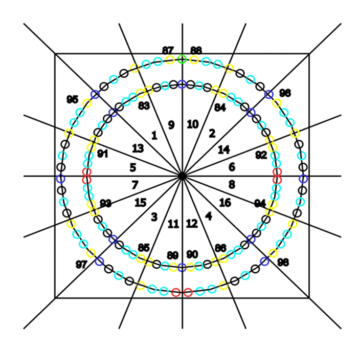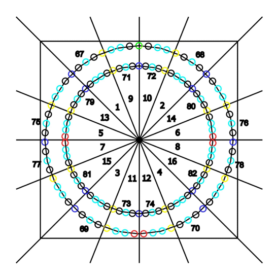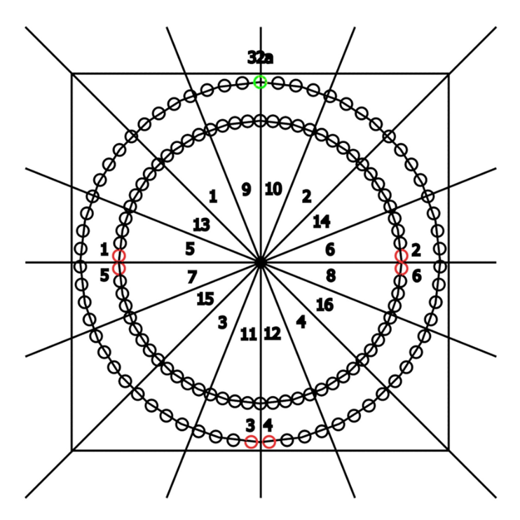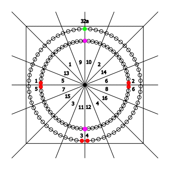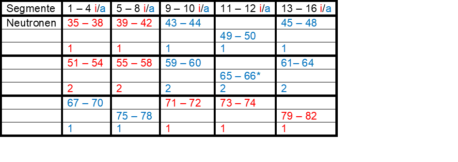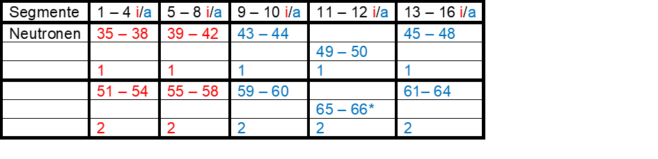 Nach der bisherigen Regel „Kreiswechsel nach spätestens acht eingebauten Neutronen“ müsste jetzt wieder ein Kreiswechsel von außen nach innen erfolgen. In die Segmente 1a – 4a, 5a – 8a, 9i – 12i und 13i – 16i sind bis jetzt aber noch gar keine Neutronen eingebaut worden. Da mit den Neutronen 65 und 66 die Segmente 11a und 12a voll belegt sind (Teilsegmentabschluss), gibt es für die Neutronen 67 – 70 keinen Kreiswechsel, der Einbau erfolgt in die Segmente 1a – 4a (75/70 →155/70).