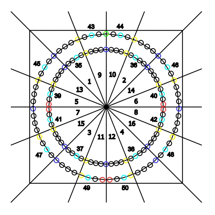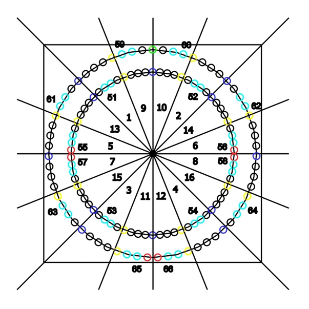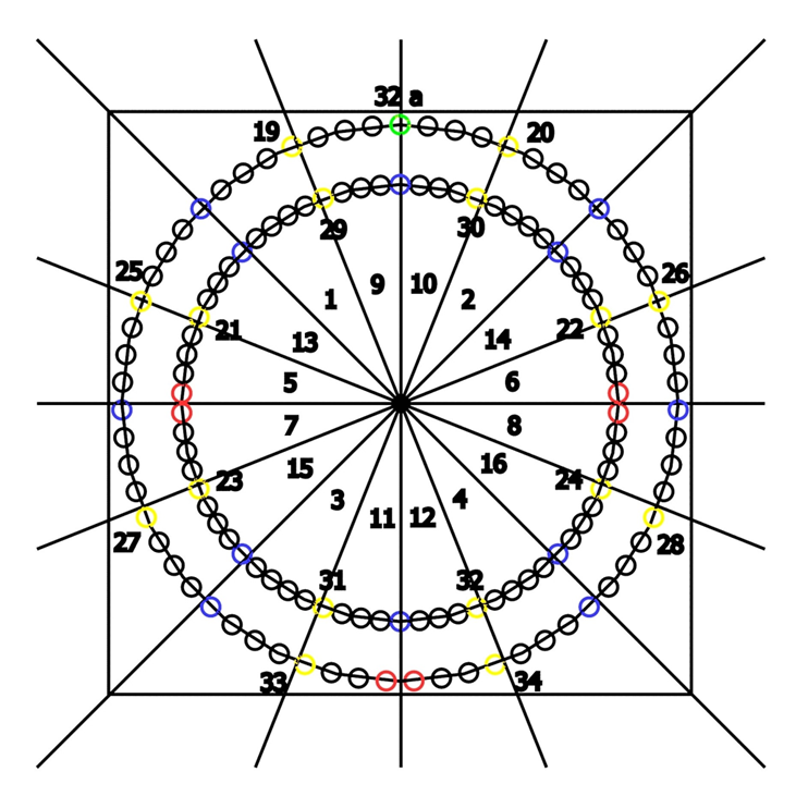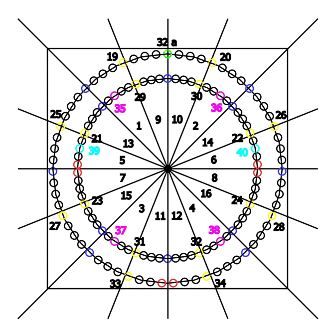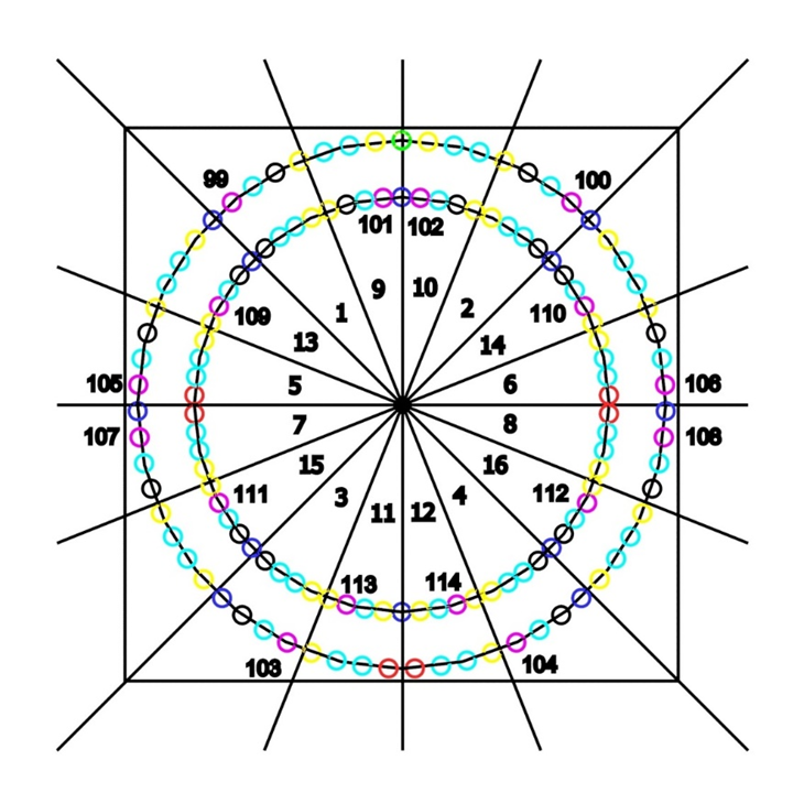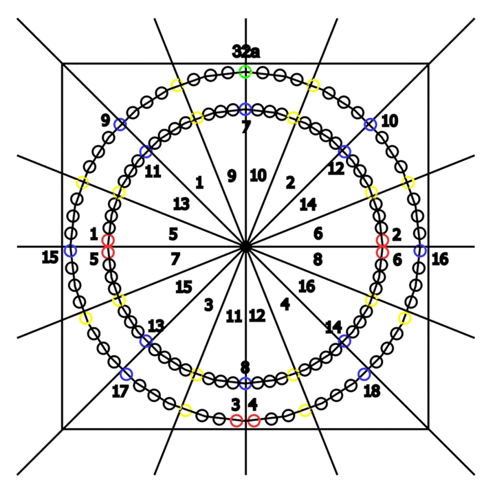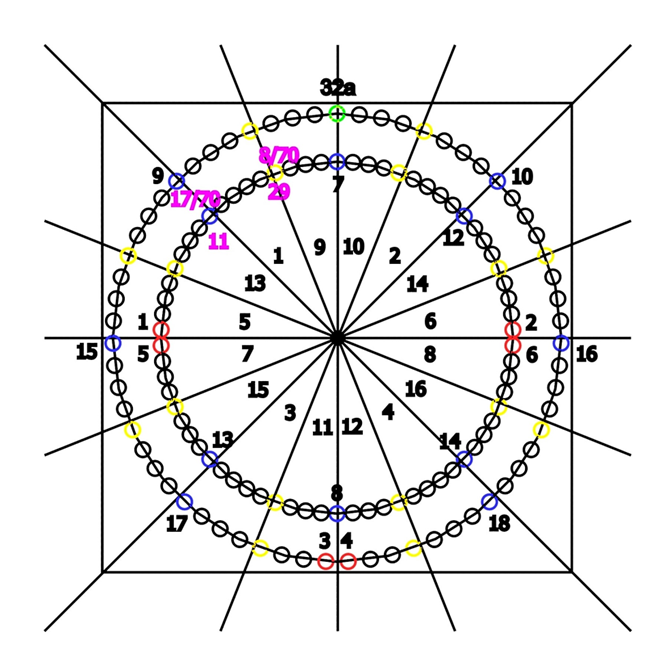 Die Neutronen 99 und 100 werden weiter auf dem äußeren Kreis in die Segmente 1a – 2a eingebaut (155/70 → 235/70, Tabelle 26), da es dort noch den meisten Platz gibt. Danach könnten noch zwei weitere Neutronen auf dem äußeren Kreis eingebaut werden, bevor es nach acht hintereinander eingebauten Neutronen zwangsläufig zu einem Kreiswechsel kommt. Hier gibt wieder der noch zu besprechende geometrische Boden in der Sultan Hasan Moschee etwas anderes vor. Das Neutronenpaar 101 / 102 soll auf dem inneren Kreis in die Segmente 9i – 10i eingebaut werden (171/70 → 243/70).