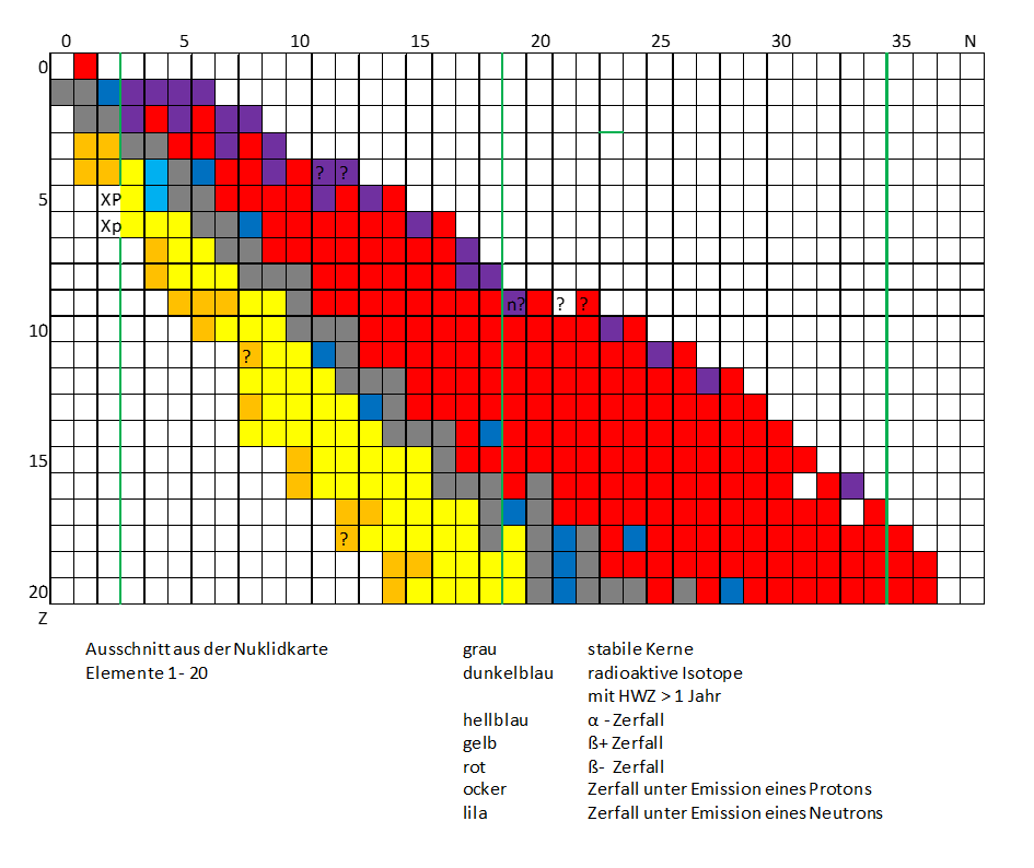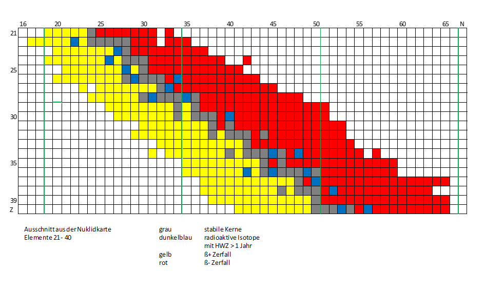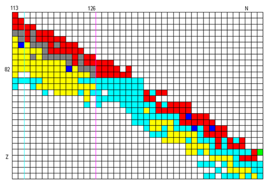 Nach Einbau weiterer vier Neutronen (Neutronen 123 – 126) ergibt sich wiederum ein Schalenabschluss für die Segmente 13 – 16. Auch hier folgt eine Stabilitätslücke. Stabile Atomkerne mit 127 Neutronen gibt es nicht. Die Zahl 126 ist auch eine sogenannte „magische Zahl“ und ist ganz klar dem Neutronenbereich zuzuordnen. Kerne mit 126 Neutronen sind die letzten stabilen Atomkerne. Alle Kerne mit mehr als 126 Neutronen sind instabil, also radioaktiv. Die verbleibenden Segmente 5a – 8a und 9i – 10i können offenbar keine stabilen Atomkerne mehr hervorbringen.