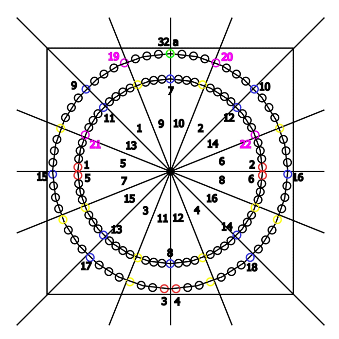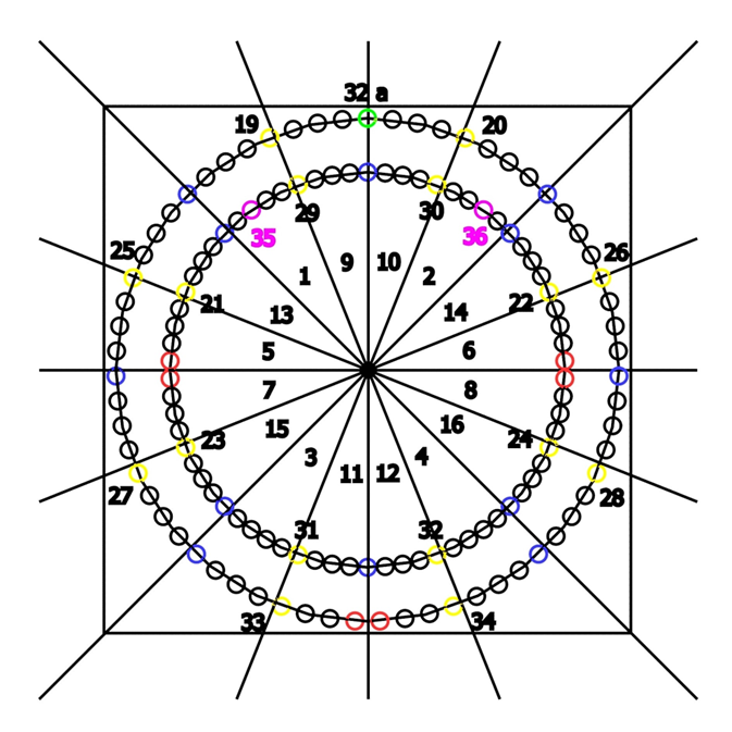 Prinzipiell werden die Neutronen als Sechzehnerserien in die Neutronenringe eingebaut. Die Serie 1 – 18 ist eigentlich eine verkappte Sechzehnerserie, denn 13 der 16 Segmenttrennunslinien teilen je ein Neutron. Fasst man die Neutronen 1/5, 2/6 und 3/4 der restlichen drei Segmenttrennungslinien als je eine Position auf, hat man auch hier wieder eine Sechzehnerserie.