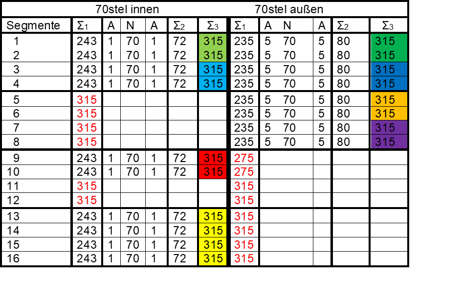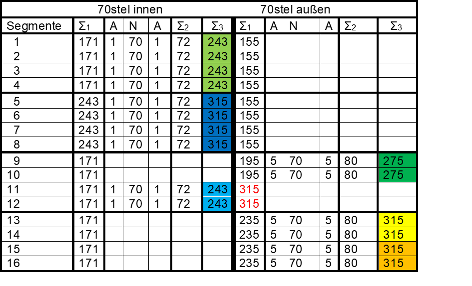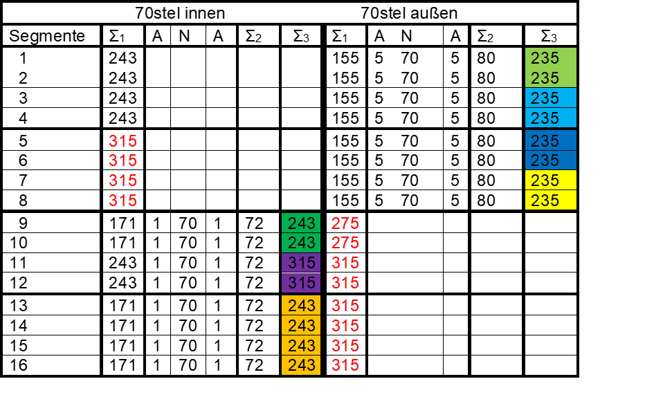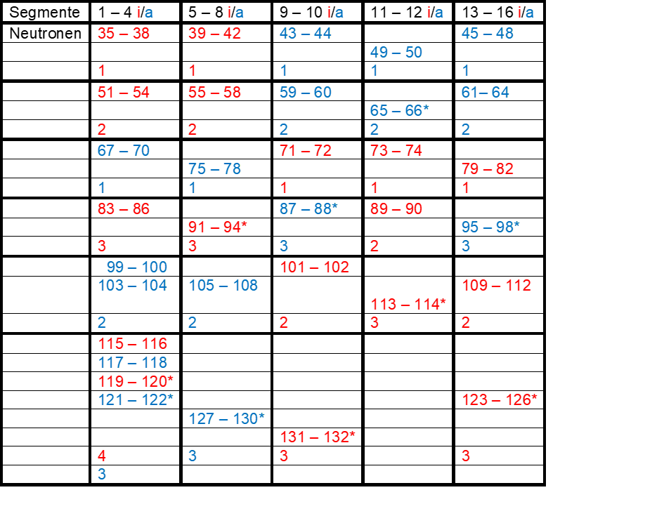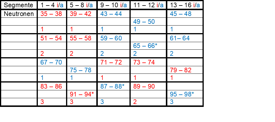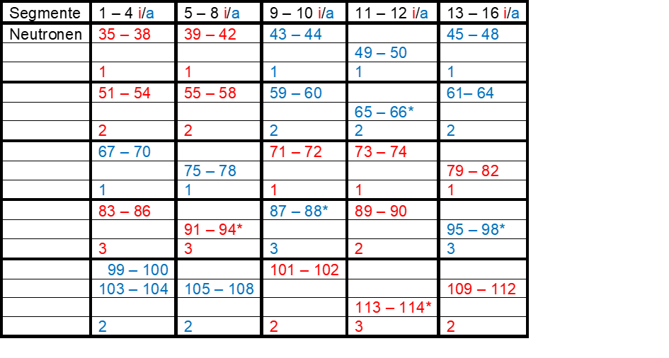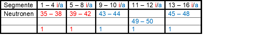 Aber es wäre auch abweichend von den bisherigen Regeln möglich, dass die Neutronen 91 – 94 in die Segmente 5i – 8i (243/70 → 315/70) und die Neutronen 95 – 98 in die Segmente 13a – 16a (235/70 → 315/70) eingebaut werden. Bisher sind die Segmente 5 – 8 auch stets vor den Segmenten 13 – 16 belegt worden, so dass ich dieser Lösung hier den Vorzug gegeben habe.