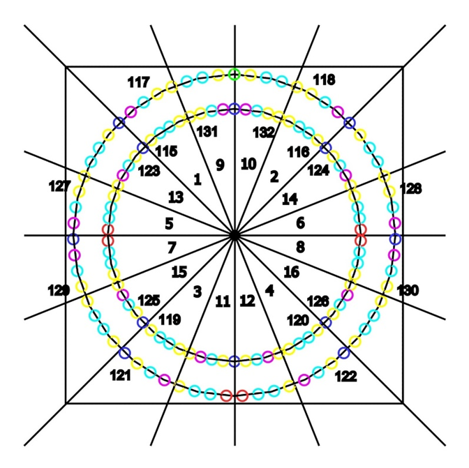 Das hier dargestellte Schema für die Neutronen 115 bis 132 mag willkürlich erscheinen, da mehrmals 243/70 vor 235/70 vorkommt. Ich bin aber lediglich den Anweisungen aus dem noch zu besprechenden geometrischen Boden der Sultan Hasan Moschee gefolgt.
