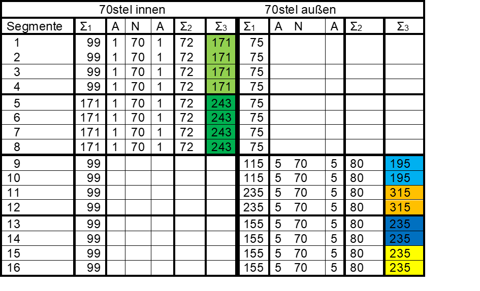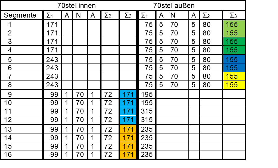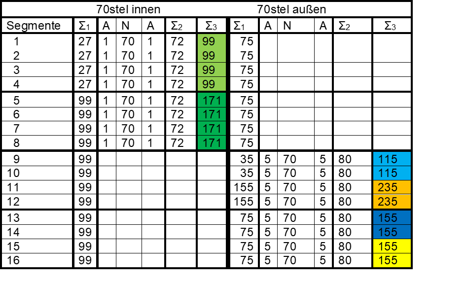 Mit den Neutronen 71, 72 und 73, 74 kommt es dann zum Kreiswechsel von außen nach innen. Sie werden in die Segmente 9i – 10i und 11i – 12i (99/70 → 171/70) eingebaut. Da beim Neutronenpaar 71 / 72 in Segment 9 Position 32a nicht belegt ist, erfolgt der Einbau des Neutronenpaars dort und nicht in den mit gleich viel 70steln belegten Segmenten 13i – 16i. Zwangsläufig folgen dann die Segmente 11i – 12i mit dem Neutronenpaar 73 / 74.