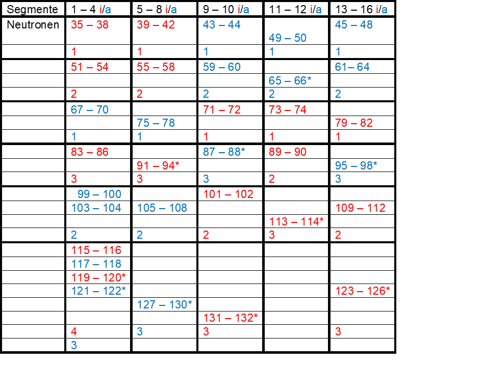 Den Abschluss bilden die Neutronen 131 und 132 auf dem inneren Kreis in den Segmenten 9i – 10i (243/70 → 315/70).