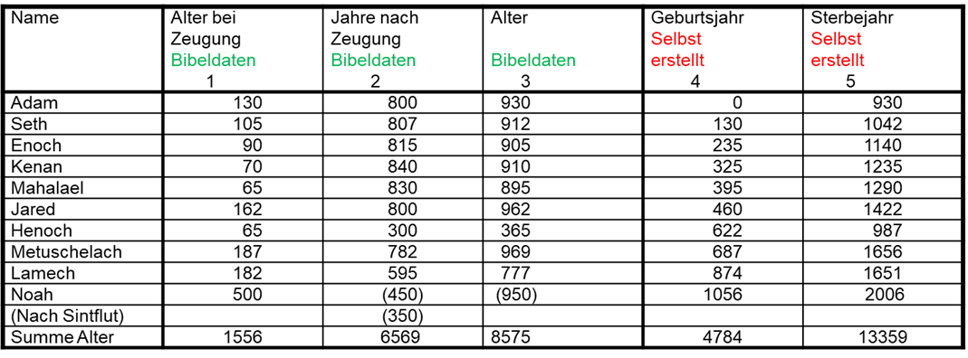 Die Zahlen der ersten drei Zahlenspalten stehen alle wortwörtlich offen in der Genesis. Die Zahlen der letzten beiden Zahlenspalten muss man selbst errechnen, sie sind also verborgen.
