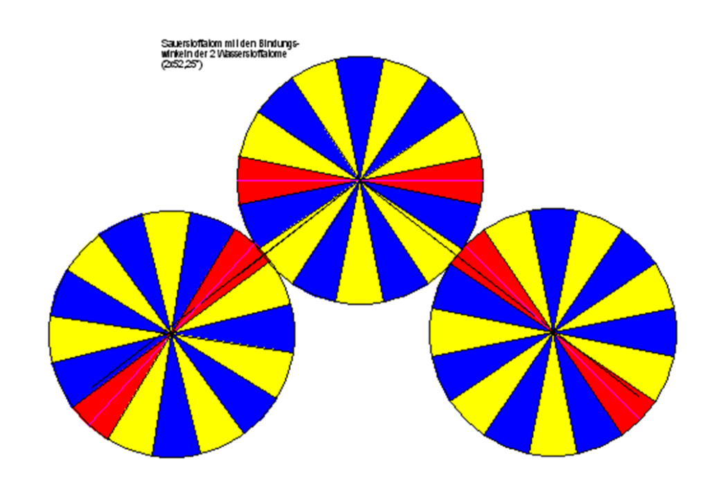 Ein bisher ungeklärtes Faktum in der Atomphysik ist die Verbindung von zwei Wasserstoffatomen mit einem Atom Sauerstoff zu einem Wassermolekül. Nach der herrschenden Orbitaltheorie des Standardmodells sollte der Bindungswinkel zwischen den Wasserstoffatomen und dem Sauerstoffatom 109,5° betragen (Tetraederwinkel des sp3-Hybridorbitals). In Wirklichkeit liegt der Winkel aber bei 104,5°. Im hier vorgestellten Modell binden die Achtundzwanzigstelelektronen von Wasserstoff in ihren roten Bezirken und die des Sauerstoffs (geradzahliges Element, bindende Elektronenachtundzwanzigstel in den gelben Sektoren/Bezirken) in den Bezirken Gelb 1a und Gelb 3b (siehe Abb.7), so dass der in der Natur vorkommende Bindungswinkel von 104,5° ganz exakt realisiert werden kann.