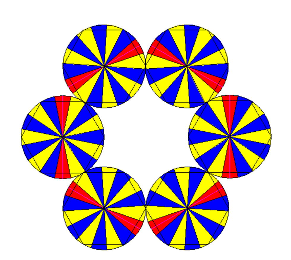 Abb.8: Chiralität des Benzolrings. Dargestellt ist der bindende (innere kleinere) Elektronenring als Kreis. Der Kreismittelpunkt ist der Atomkern, der zweite (äußere größere) hier nicht gezeichnete Elektronenring steht jeweils senkrecht auf dem ersten gezeichneten.