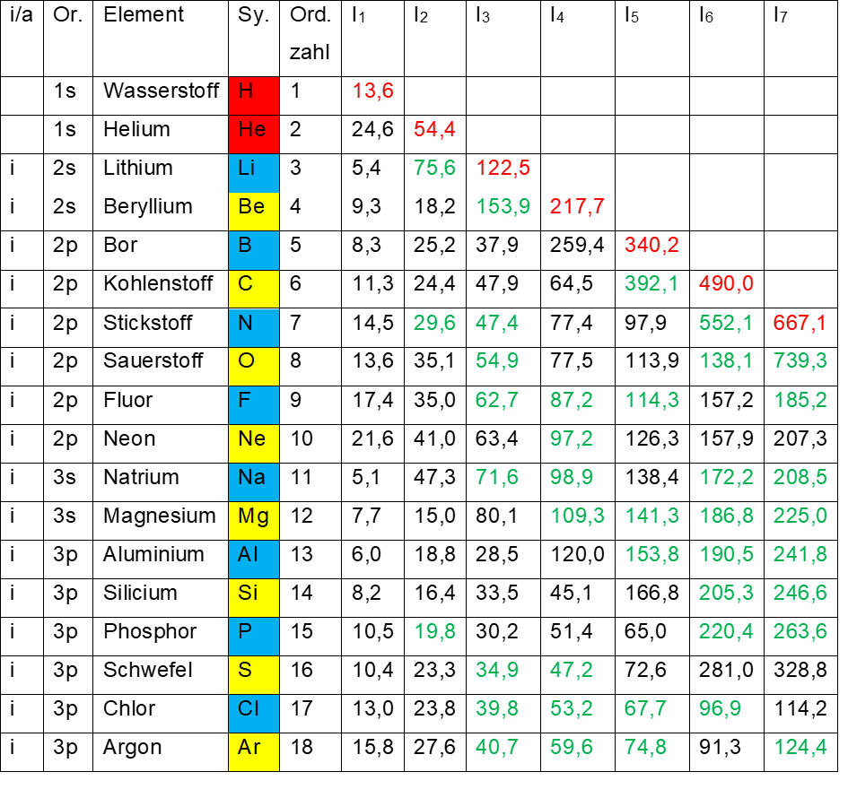 • Tab. 1:           Ionisierungsenergien I1 – I7 der Elemente 1 – 18