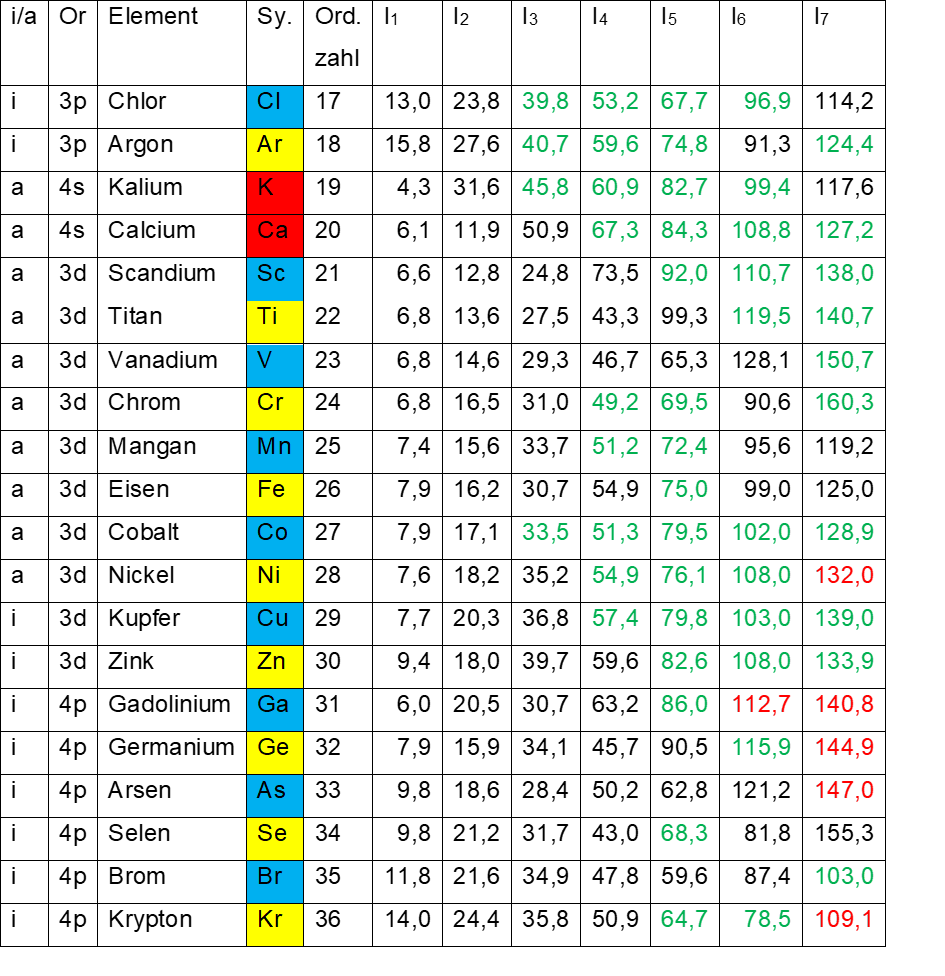 • Tab. 2:  Ionisierungsenergien I1 – I7 der Elemente 17 – 36