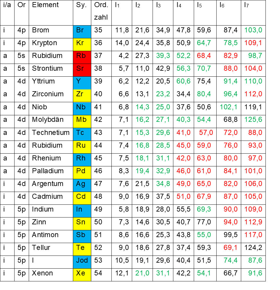 • Tab. 3:           Ionisierungsenergien I1 – I7 der Elemente 35 – 54
