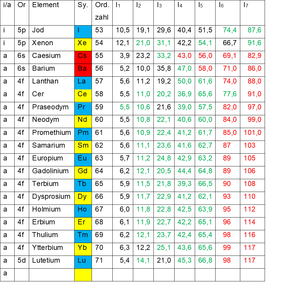 • Tab. 4:           Ionisierungsenergien I1 – I7 der Elemente 53 – 71