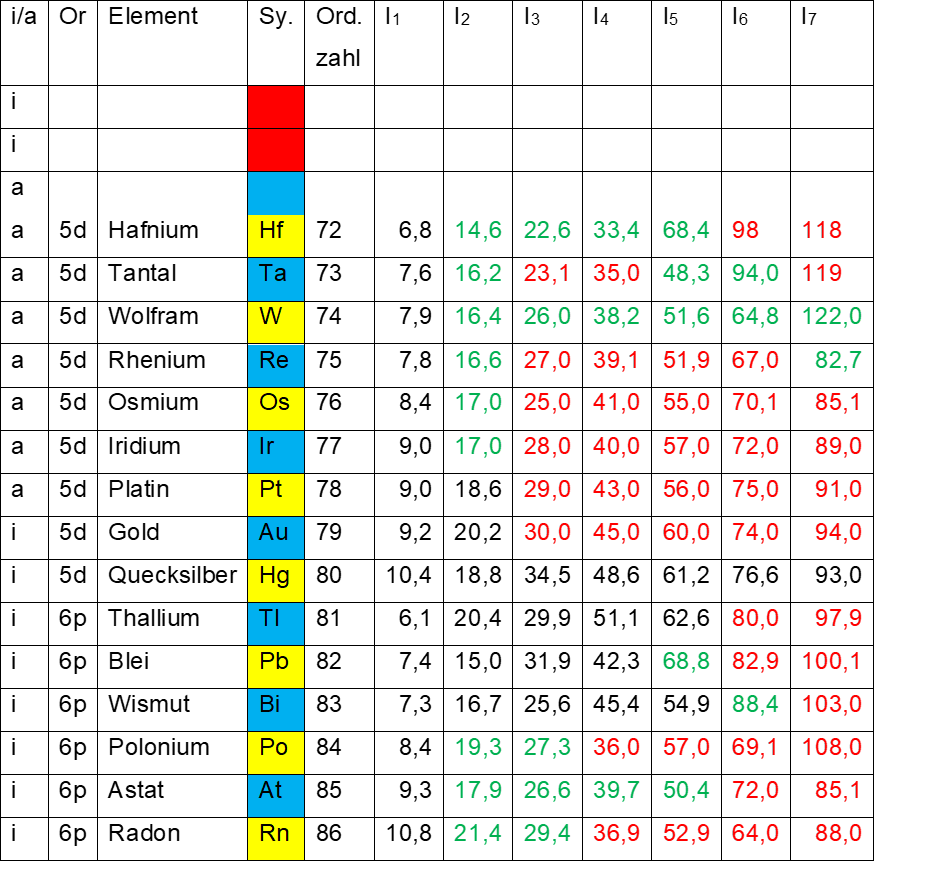 • Tab. 5:           Ionisierungsenergien I1 – I7 der Elemente 72 – 86