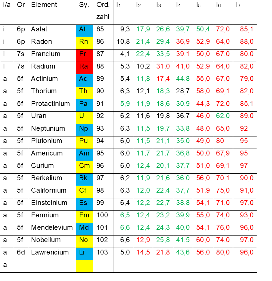 • Tab. 6:           Ionisierungsenergien I1 – I7 der Elemente 85 – 103