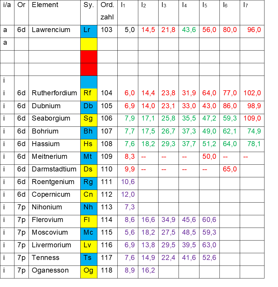 • Tab. 7:           Ionisierungsenergien I1 – I7 der Elemente 103 – 118