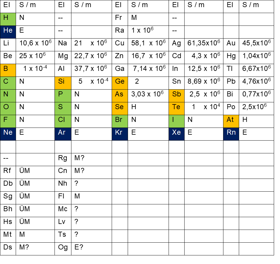 Bei den Elementen des Periodensystems wird unterschieden zwischen elektrischen Leitern, Halbleitern, elektrischen Nichtleitern und Edelgasen, wobei die Edelgase zu den elektrischen Nichtleitern gehören (siehe Tab. 8 und Tab. 9).