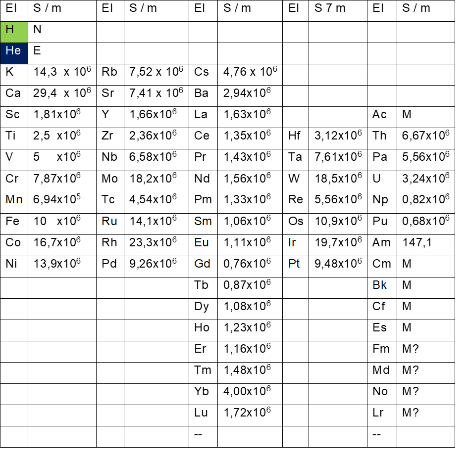 • Tab. 8: elektrische Leitfähigkeit der Elemente des inneren Elektronenrings