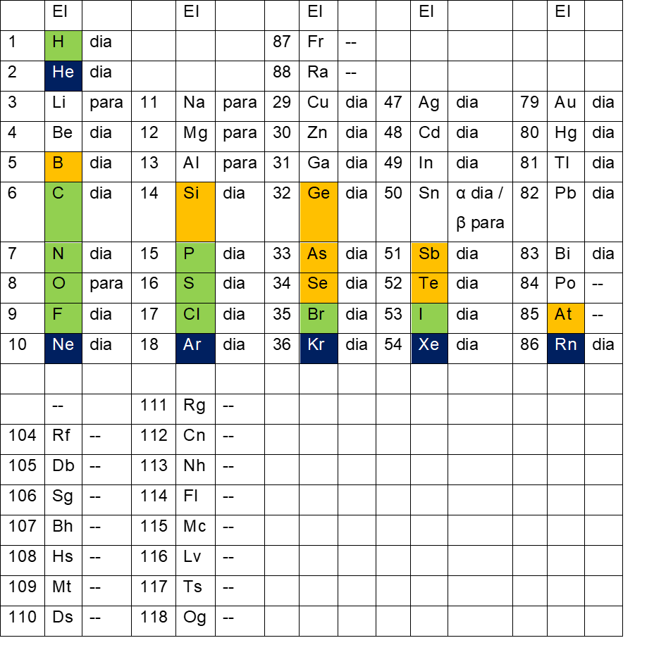 • Grün:  elektrische Nichtleiter         Orange: Halbleiter               Blau: Edelgase